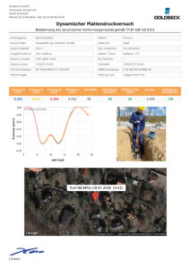 Unmittelbar nach Abschluss der Messung kann der Verdichtungsnachweis direkt auf der Baustelle ausgedruckt werden. Der Ausdruck enthält alle relevanten Messdaten wie Datum und Uhrzeit, die Setzungskurve sowie den Evd-Wert in MPa als eindeutiges Messergebnis. Dieses Ergebnis kann sofort mit den Anforderungen aus der Ausschreibung oder den geltenden Regelwerken verglichen werden – ohne Zeitverlust, ohne externes Prüflabor.